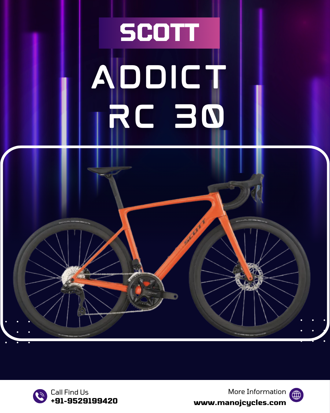 Upgrade your road cycling experience with the high-performance Scott Addict RC 30, now available at Manoj Cycles – your trusted destination for premium bikes. Designed for speed, precision, and climbing efficiency, this race-focused machine features a lightweight HMX carbon frame engineered to deliver exceptional stiffness while keeping overall weight impressively low.