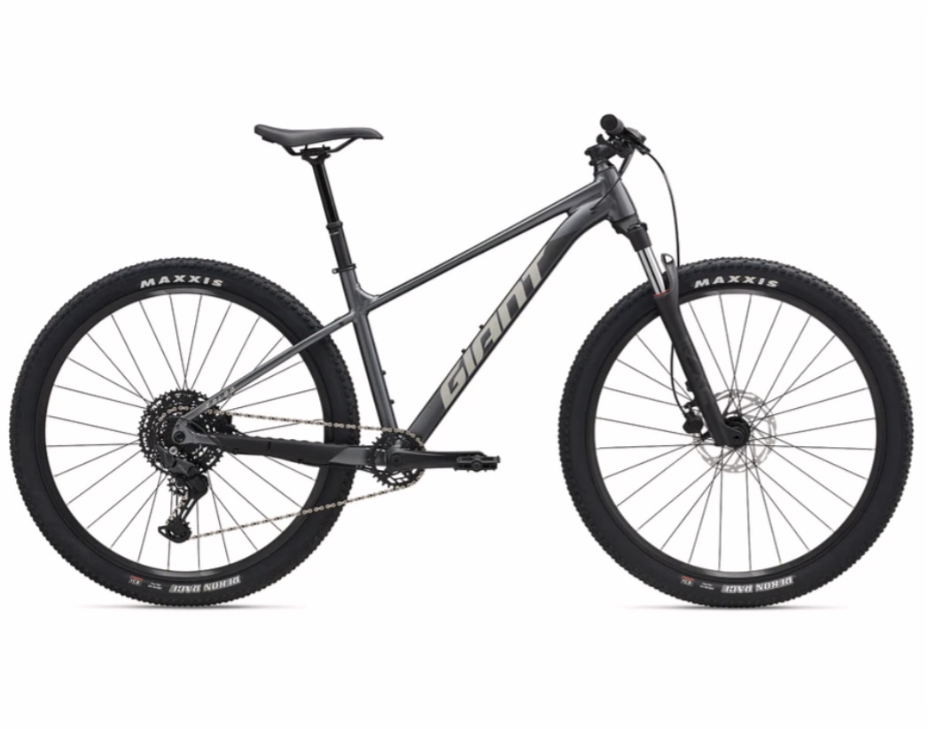Frame MaterialALUXX-grade aluminum, disc TireMaxxis Rekon 27.5x2.4“ or Maxxis Rekon Race 29x2.4”, wire bead Tire Size29" Tire Size - Measuring UnitMM ForkSXC32-3 RL, coil spring, QR, alloy steerer, 15x110 XS: 80mm travel (27.5) S: 80mm travel (27.5) / 100mm travel (29) StemGiant Sport, 7-degree XS: 40mm (27.5) S: 50mm (27.5) / 50mm (29) M: 60mm (29) Front Derailleur- HandlebarGiant Connect Trail, 31.8mm SeatpostGiant Contact Switch Core, 30.9 ShiftersShimano CUES SL-6000, 1x10 Rear DerailleurShimano CUES RD-U6000 GripGiant Sole-O Shock- CranksetProWheel Charm, 32t (27.5) or 30t (29) SaddleGiant ErgoContact Trail PedalsMTB caged BrakesTektro HDC M275, hydraulic, Tektro rotors [F]180mm, [R]160mm Hubsalloy, sealed bearing, [F] 15x110 thru axle, [R] 12x142 thru-axle CassetteShimano CUES, CS-LG300, 11x48 Brake leversTektro HDC M275 ChainKMC X-10 RimsGiant GX03V 29 or 27.5, alloy, double wall, 21mm inner width Bottom Bracketcartridge